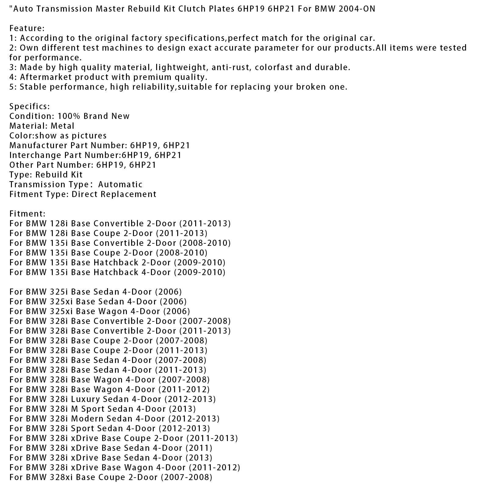 Auto Transmission Master Rebuild Kit Clutch Plates 6HP19 6HP21 For BMW 2004-ON