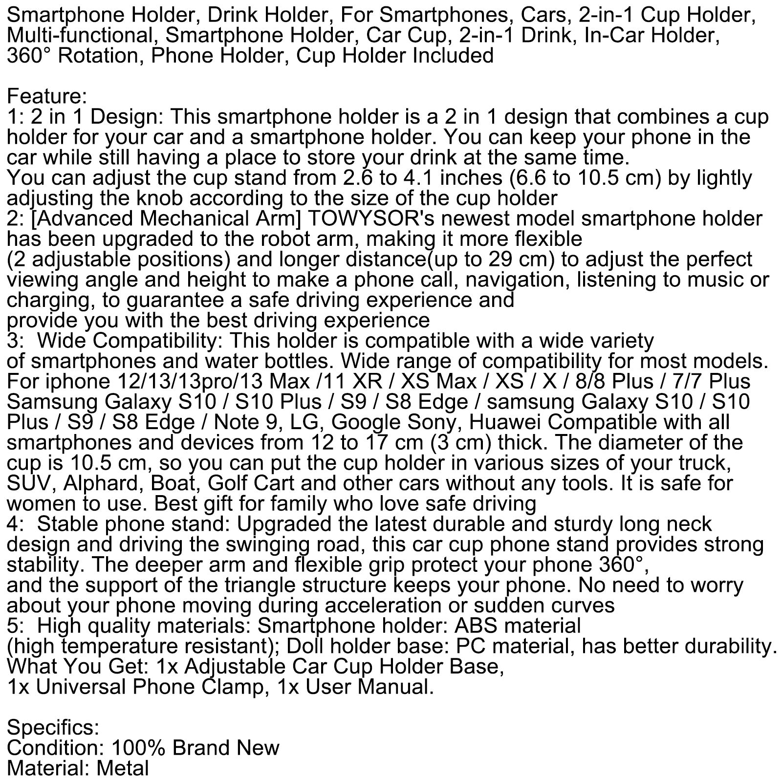 3: Wide Compatibility: This holder is compatible with a wide variety of smartphones and water bottles. Wide range of compatibility for most models. For iphone 12/13/13pro/13 Max /11 XR / XS Max / XS / X / 8/8 Plus / 7/7 Plus Samsung Galaxy S10 / S10 Plus / S9 / S8 Edge / samsung Galaxy S10 / S10 Plus / S9 / S8 Edge / Note 9, LG, Google Sony, Huawei Compatible with all smartphones and devices from 12 to 17 cm (3 cm) thick. The diameter of the cup is 10.5 cm, so you can put the cup holder in various sizes of your truck, SUV, Alphard, Boat, Golf Cart and other cars without any tools. It is safe for women to use. Best gift for family who love safe driving