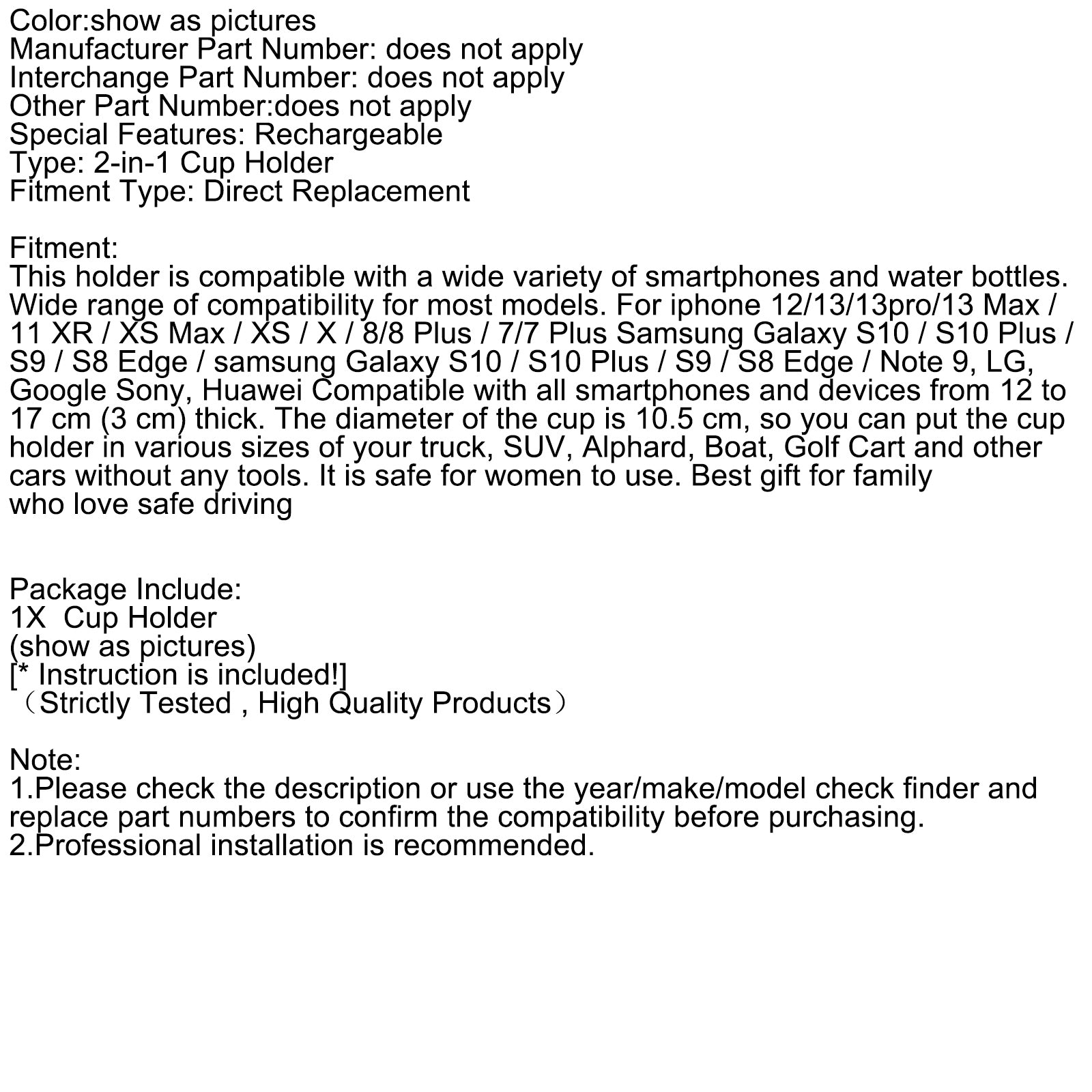 This holder is compatible with a wide variety of smartphones and water bottles. Wide range of compatibility for most models. For iphone 12/13/13pro/13 Max /11 XR / XS Max / XS / X / 8/8 Plus / 7/7 Plus Samsung Galaxy S10 / S10 Plus / S9 / S8 Edge / samsung Galaxy S10 / S10 Plus / S9 / S8 Edge / Note 9, LG, Google Sony, Huawei Compatible with all smartphones and devices from 12 to 17 cm (3 cm) thick. The diameter of the cup is 10.5 cm, so you can put the cup holder in various sizes of your truck, SUV, Alphard, Boat, Golf Cart and other cars without any tools. It is safe for women to use. Best gift for family who love safe driving