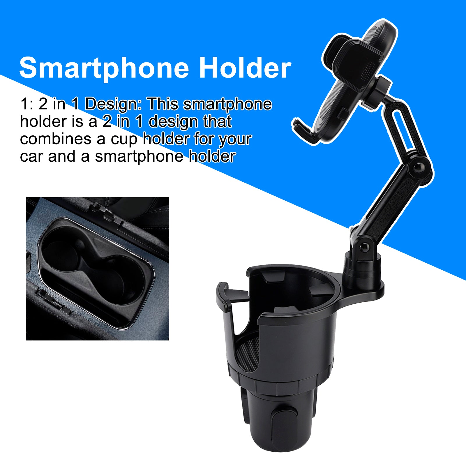 1: 2 in 1 Design: This smartphone holder is a 2 in 1 design that combines a cup holder for your car and a smartphone holder. You can keep your phone in the car while still having a place to store your drink at the same time. You can adjust the cup stand from 2.6 to 4.1 inches (6.6 to 10.5 cm) by lightly adjusting the knob according to the size of the cup holder