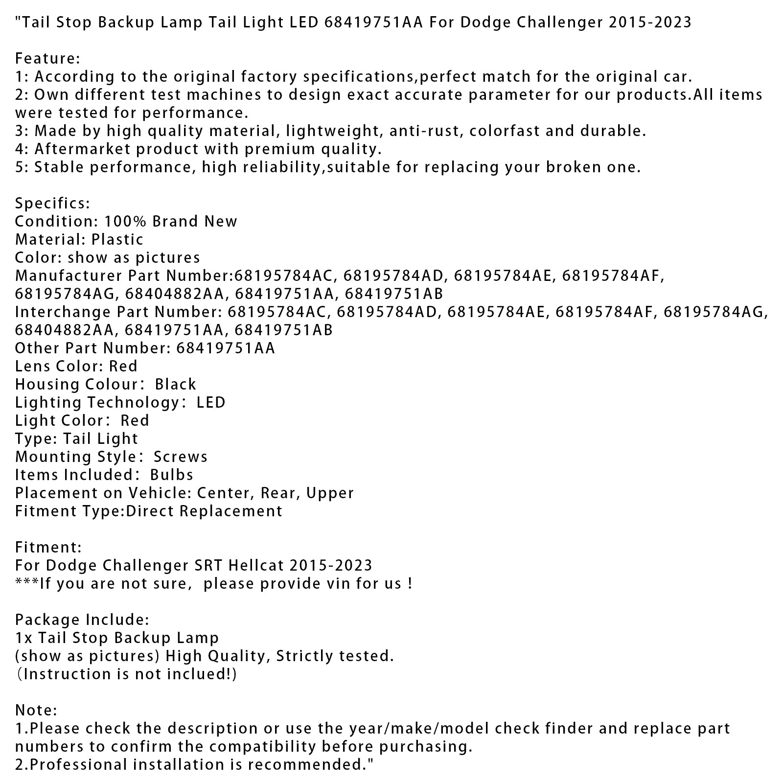 Tail Stop Backup Lamp Tail Light LED 68419751AA For Dodge Challenger 2015-2023