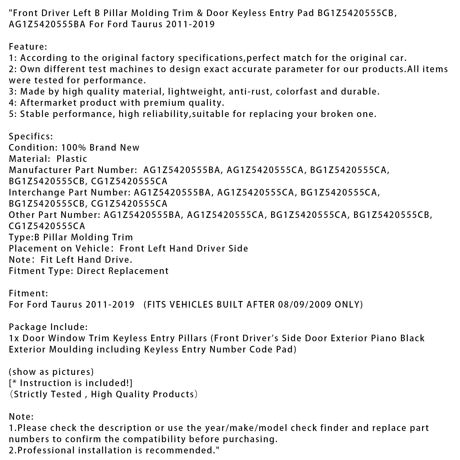 Front Driver Left B Pillar Molding Trim & Door Keyless Entry Pad BG1Z5420555CB,AG1Z5420555BA For Ford Taurus 2011-2019