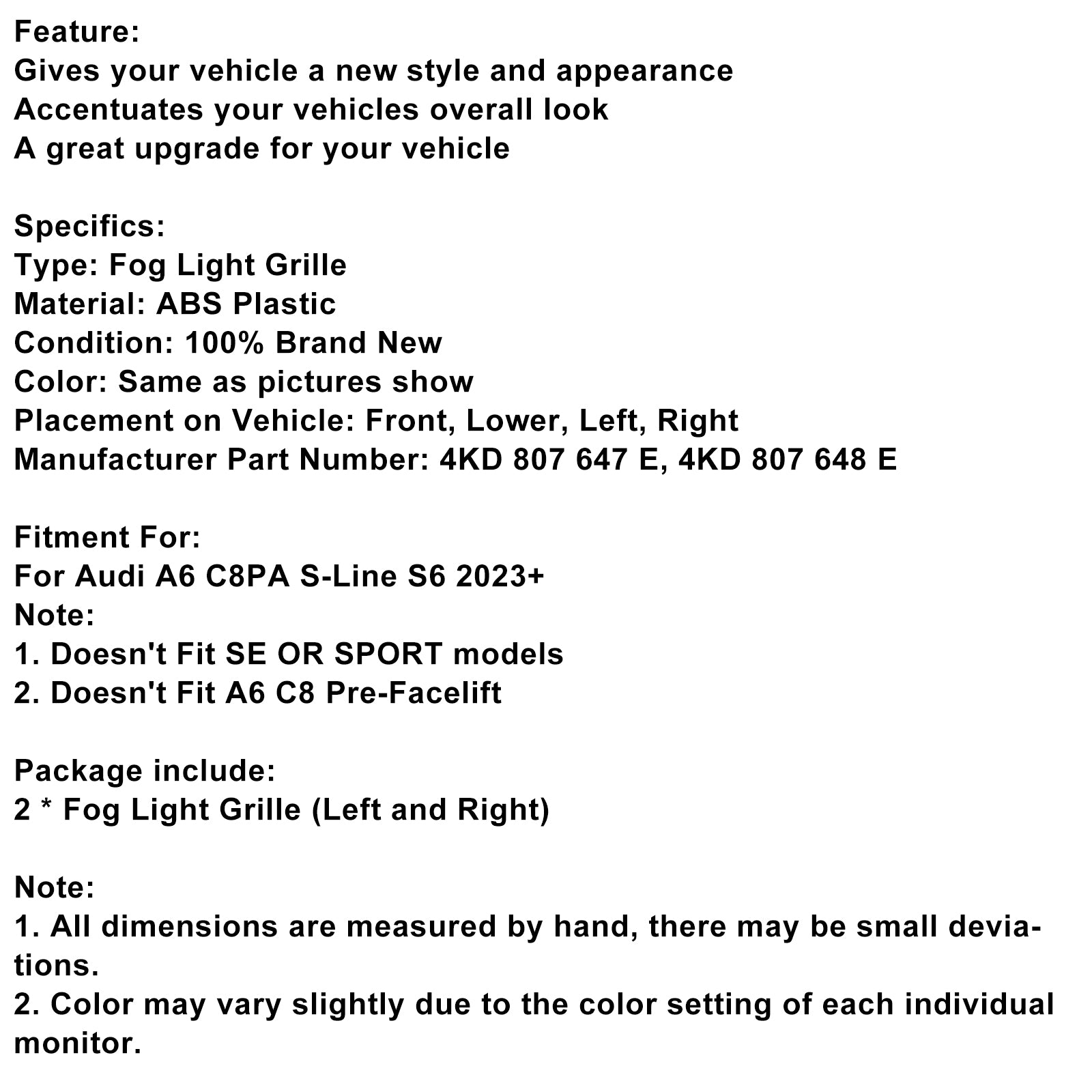 2PCS Front Bumper Fog Light Grille Trim Fit Audi A6L C8PA 2023+ Black