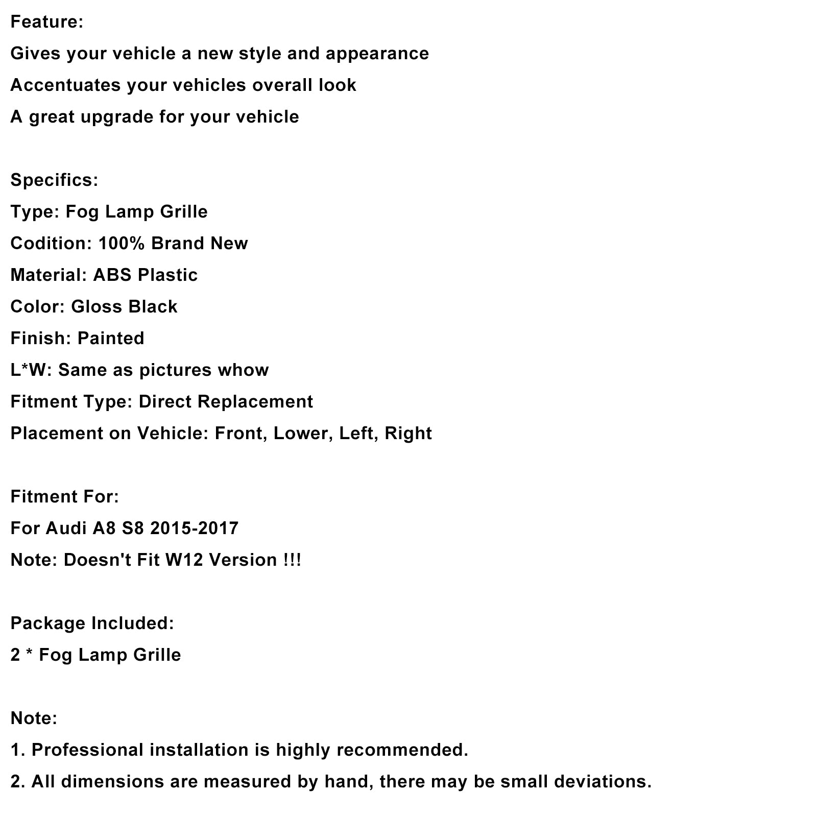 2PCS Black Front Fog Grill Grille Light Cover Fit Audi A8 S8 2015-2017
