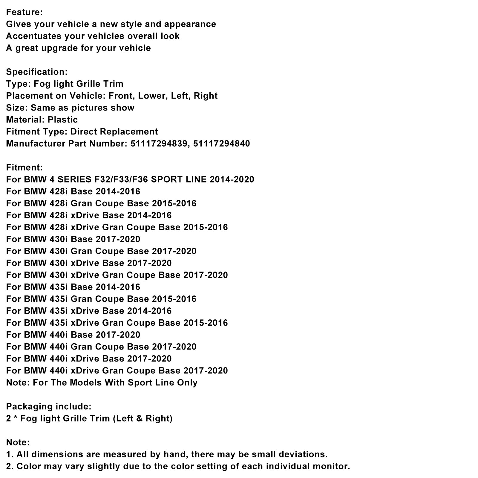 Left & Right Fog Light Bezel Grille Front Bumper Trim Fit BMW 428i F32 F33 F36