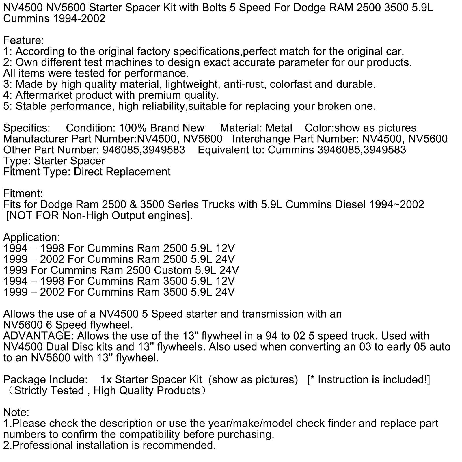 NV4500 NV5600 Starter Spacer Kit with Bolts 5 Speed For Dodge RAM 2500 3500 5.9L Cummins 1994-2002