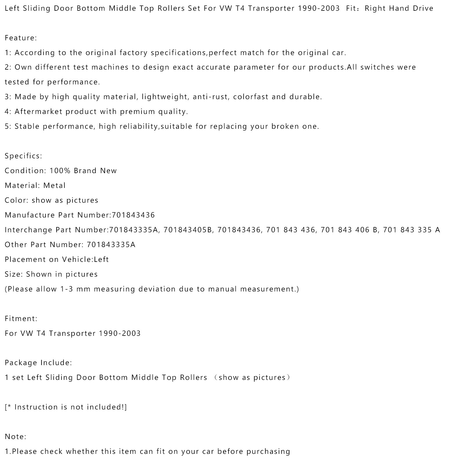 1990-2003 VW T4 Transporter RHD Left Sliding Door Bottom Middle Top Rollers Generic