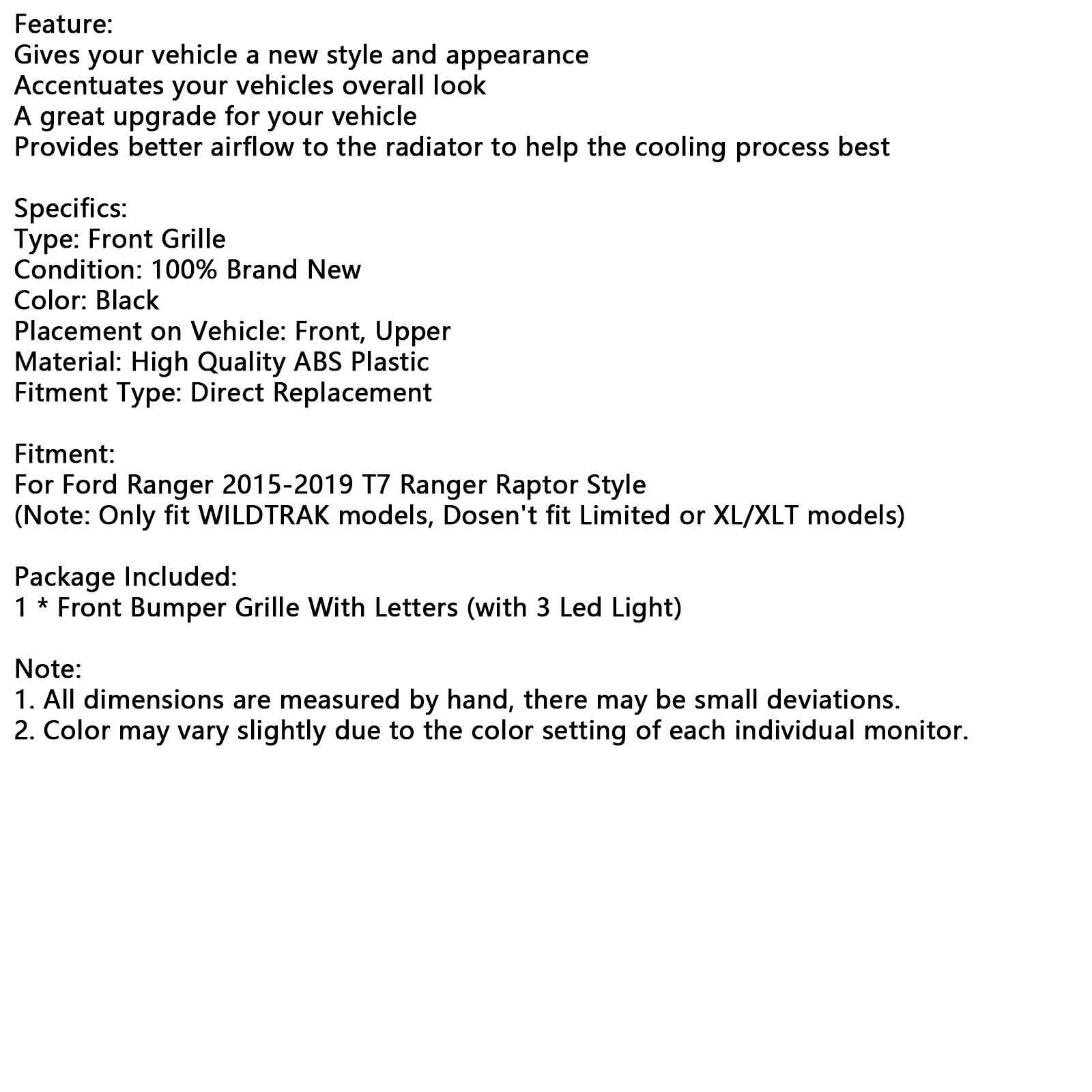 (Note: Only fit WILDTRAK models, Dosen't fit Limited or XL/XLT models)