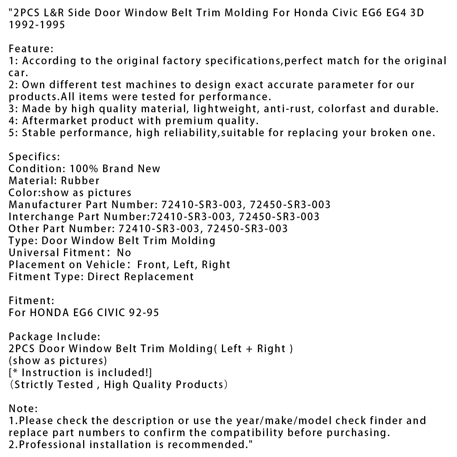 2PCS L&R Side Door Window Belt Trim Molding For Honda Civic EG6 EG4 3D 1992-1995