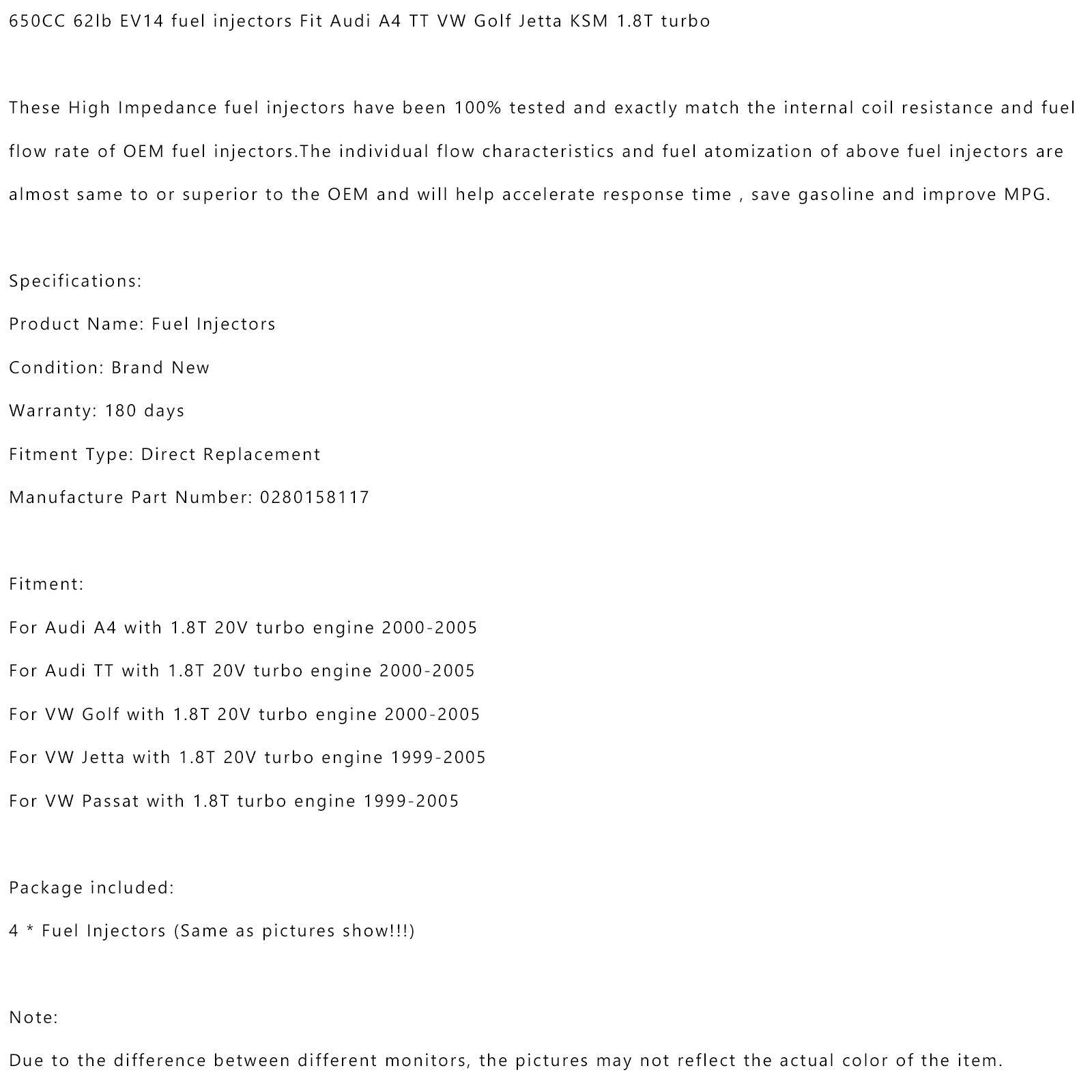 2000-2005 Audi A4 1.8T 4PCS 650CC 62lb EV14 Fuel Injectors 0280158117 Generic