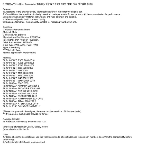 2008 Infiniti G37 Valve Body Solenoid w/ TCM RE5R05A Generic
