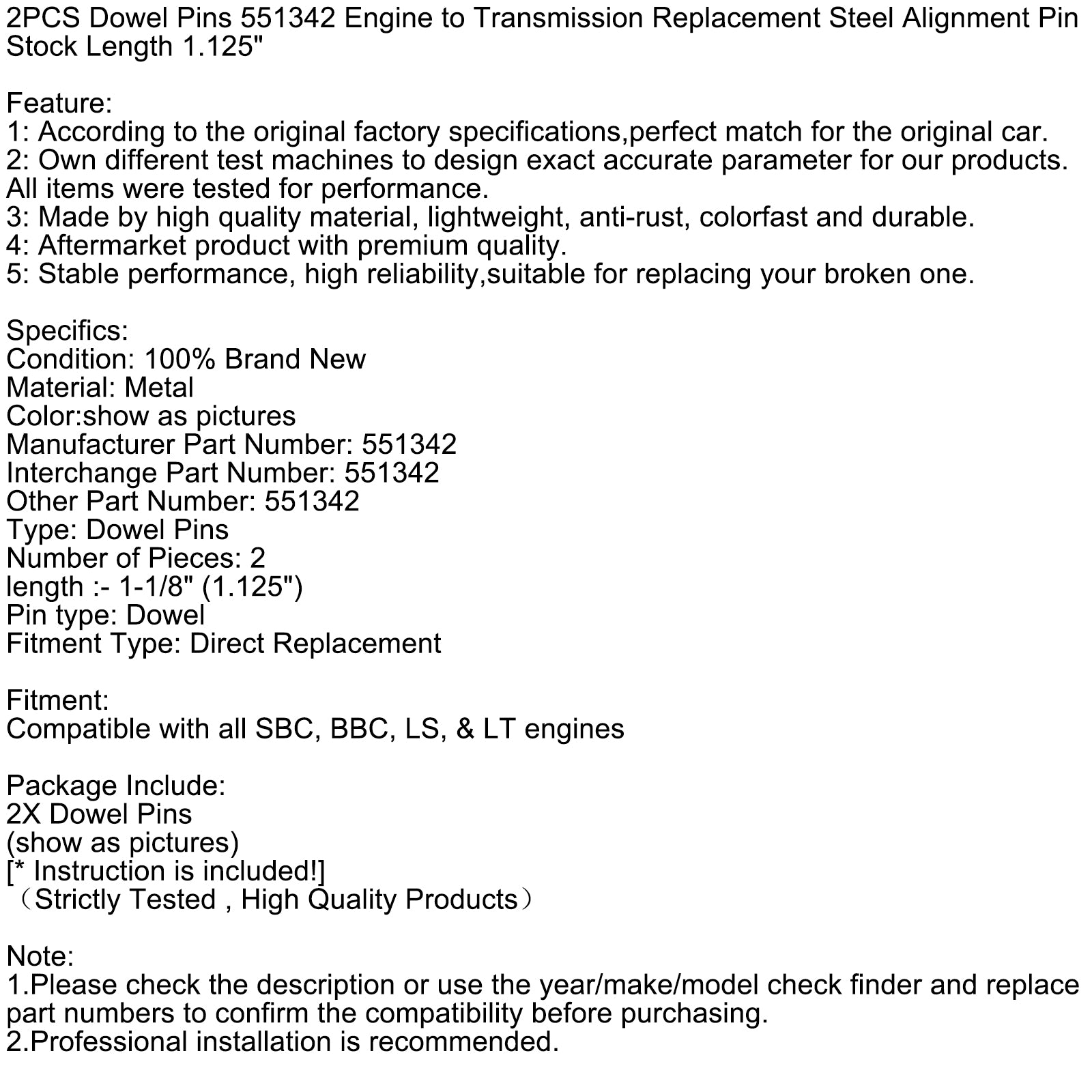 2PCS Dowel Pins 551342 Engine to Transmission Alignment Pin Stock Length 1.125"