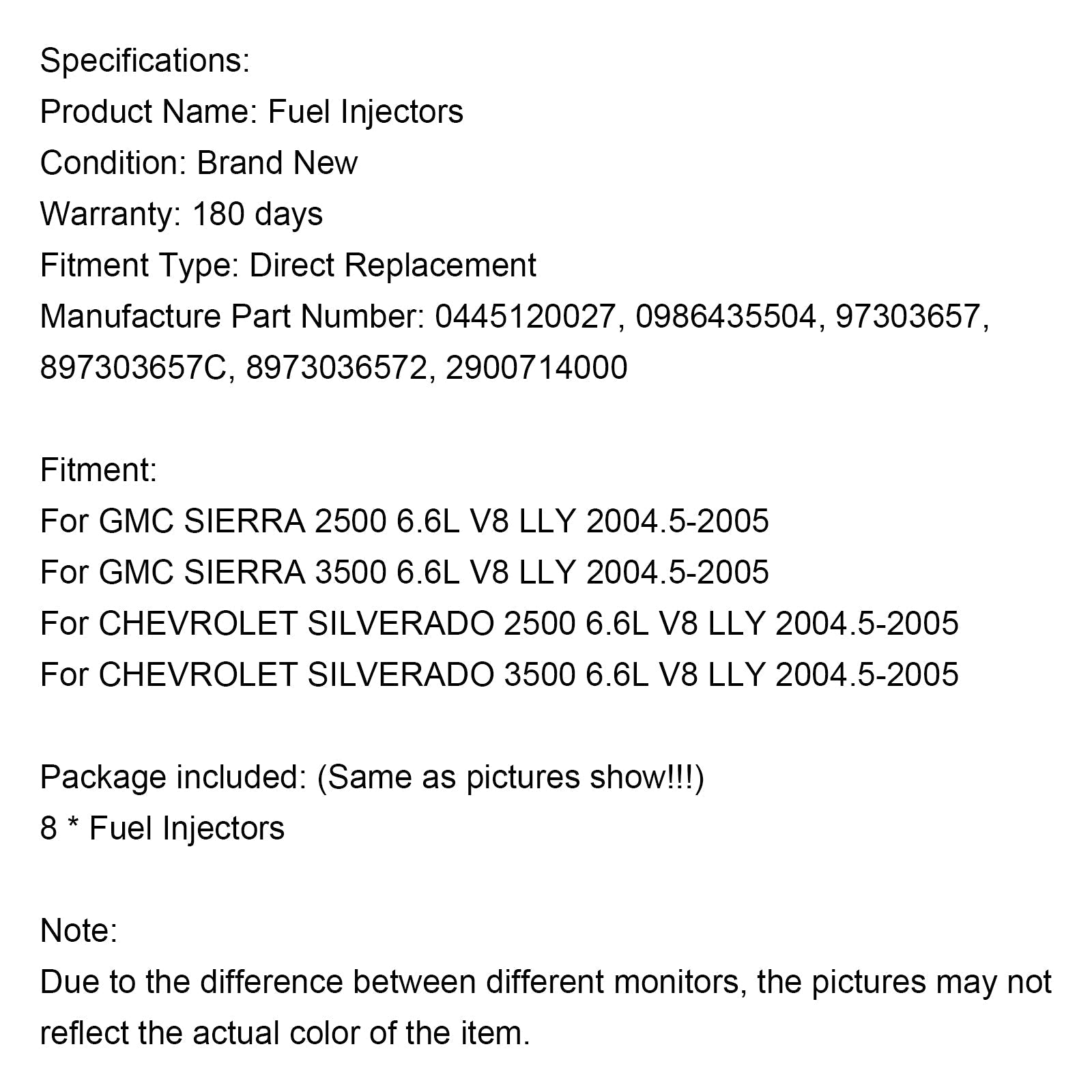 2004.5-2005 Chevy SILVERADO 2500/3500 6.6L V8 LLY 8PCS Fuel Injector 0986435504 97303657 0445120027 Generic