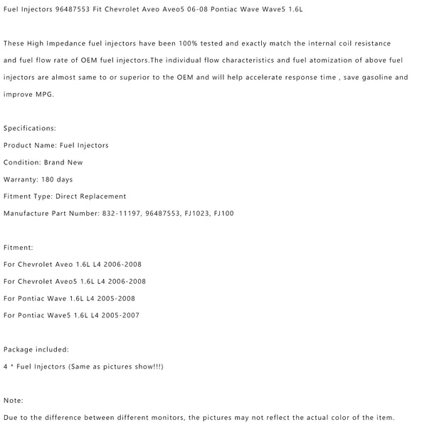 4PCS Fuel Injectors 96487553 Fit Chevrolet Aveo Aveo5 06-08 Pontiac Wave Wave5 Generic