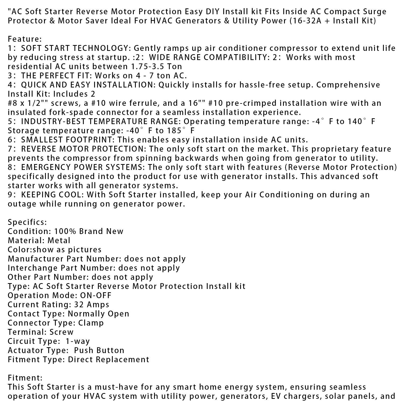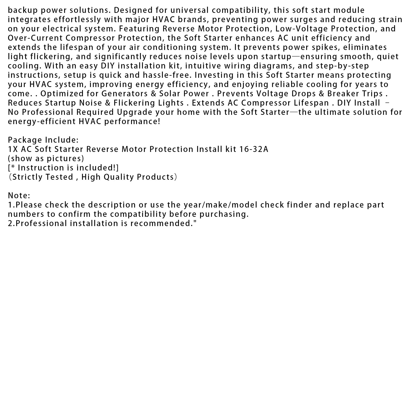 This Soft Starter is a must-have for any smart home energy system, ensuring seamless operation of your HVAC system with utility power, generators, EV chargers, solar panels, and backup power solutions. Designed for universal compatibility, this soft start module integrates effortlessly with major HVAC brands, preventing power surges and reducing strain on your electrical system. Featuring Reverse Motor Protection, Low-Voltage Protection, and Over-Current Compressor Protection, the Soft Starter enhances AC unit efficiency and extends the lifespan of your air conditioning system. It prevents power spikes, eliminates light flickering, and significantly reduces noise levels upon startup—ensuring smooth, quiet cooling. With an easy DIY installation kit, intuitive wiring diagrams, and step-by-step instructions, setup is quick and hassle-free. Investing in this Soft Starter means protecting your HVAC system, improving energy efficiency, and enjoying reliable cooling for years to come. . Optimized for Generators & Solar Power . Prevents Voltage Drops & Breaker Trips . Reduces Startup Noise & Flickering Lights . Extends AC Compressor Lifespan . DIY Install – No Professional Required Upgrade your home with the Soft Starter—the ultimate solution for energy-efficient HVAC performance!