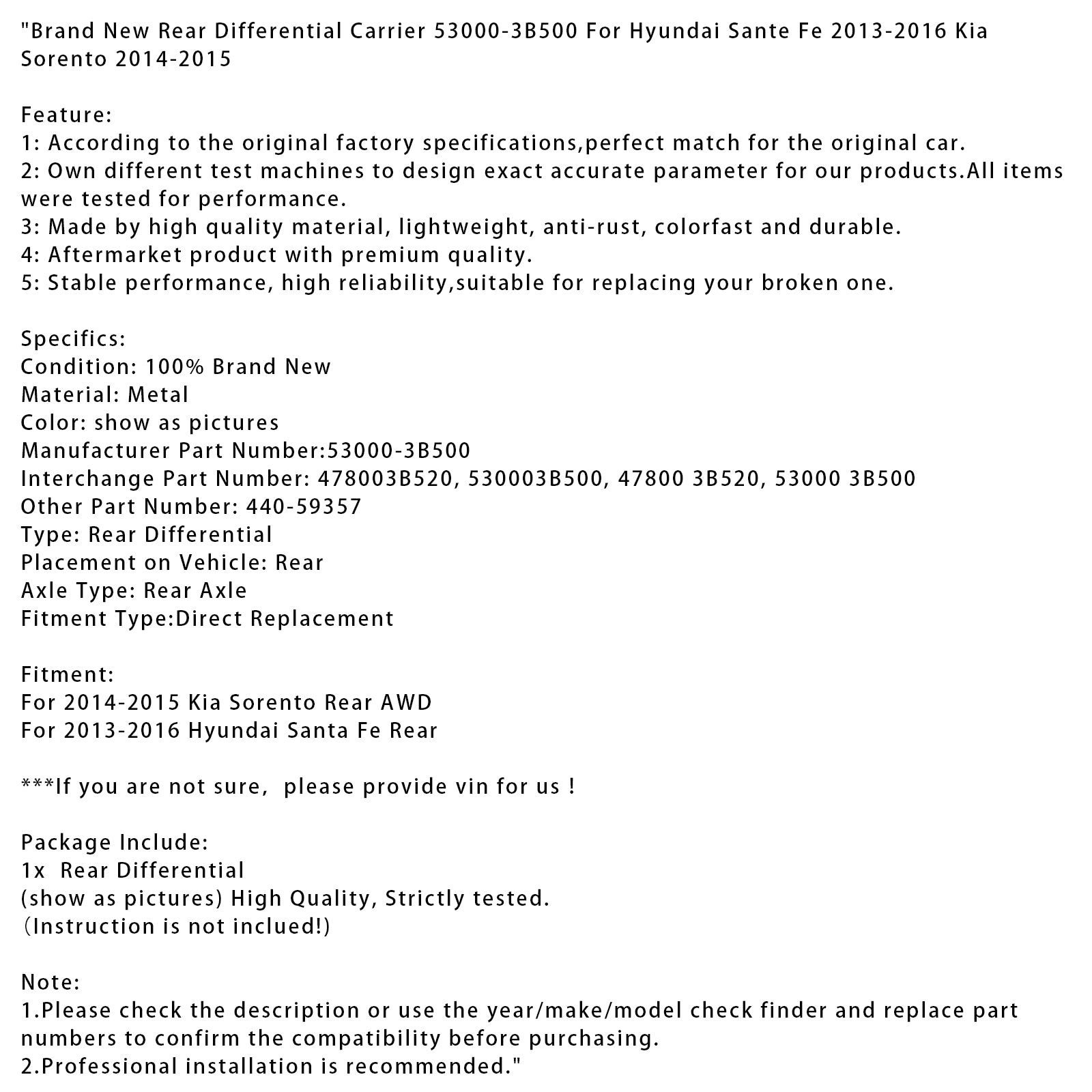 Brand New Rear Differential Carrier 53000-3B500 For Hyundai Sante Fe 2013-2016 Kia Sorento 2014-2015