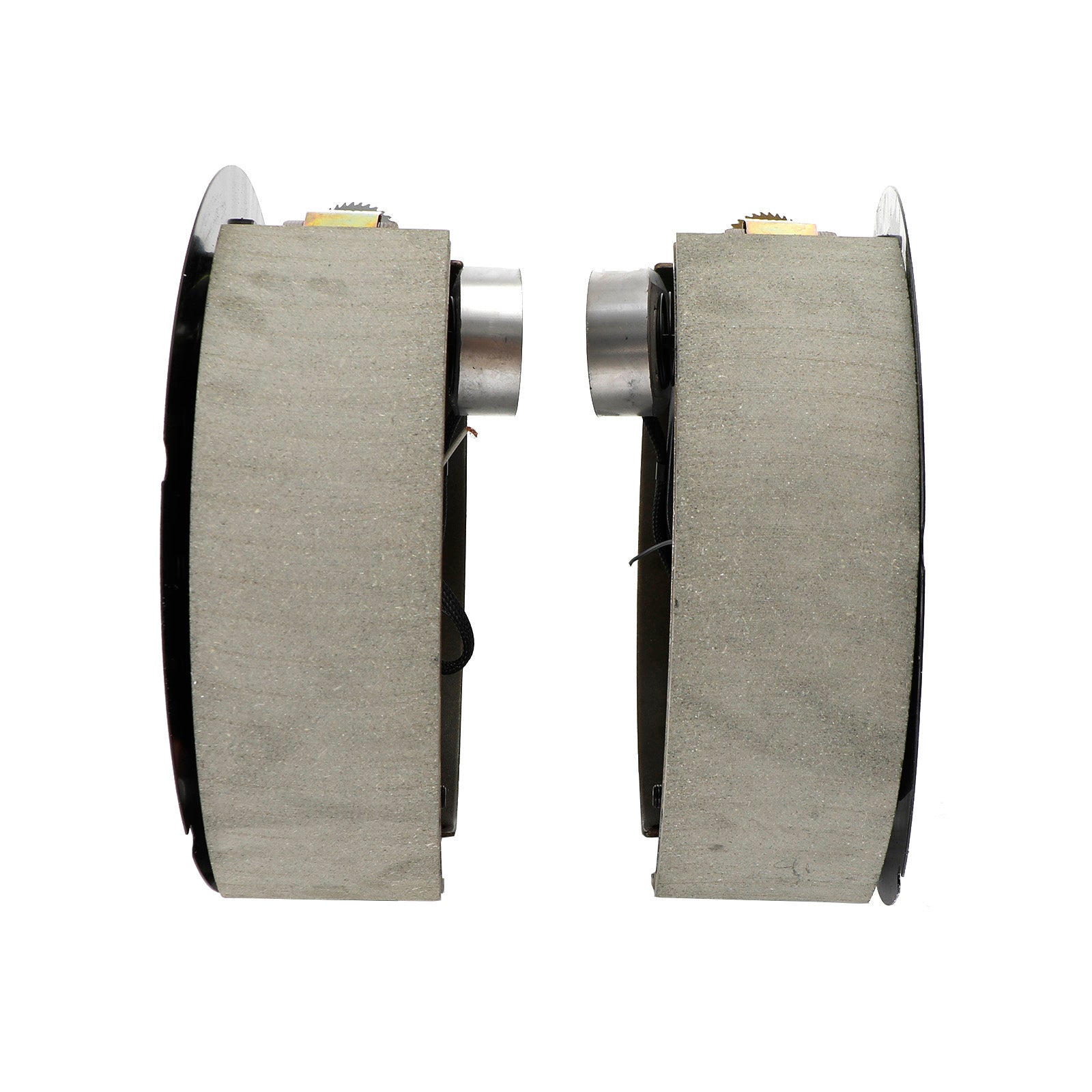 Each shoe on these brake assemblies is lined with automotive-grade friction material for improved stopping performance and longevity. The friction material is fully bonded onto the surface of the brake shoe. This lining is custom-molded for a perfect fit. The edges are tapered to ensure long-lasting performance. This taper, along with the circular grinding that the lining undergoes, helps to prevent cracking and crumbling. This durability helps to prevent mechanical lockup, which can occur when brake shoes are excessively worn or broken.