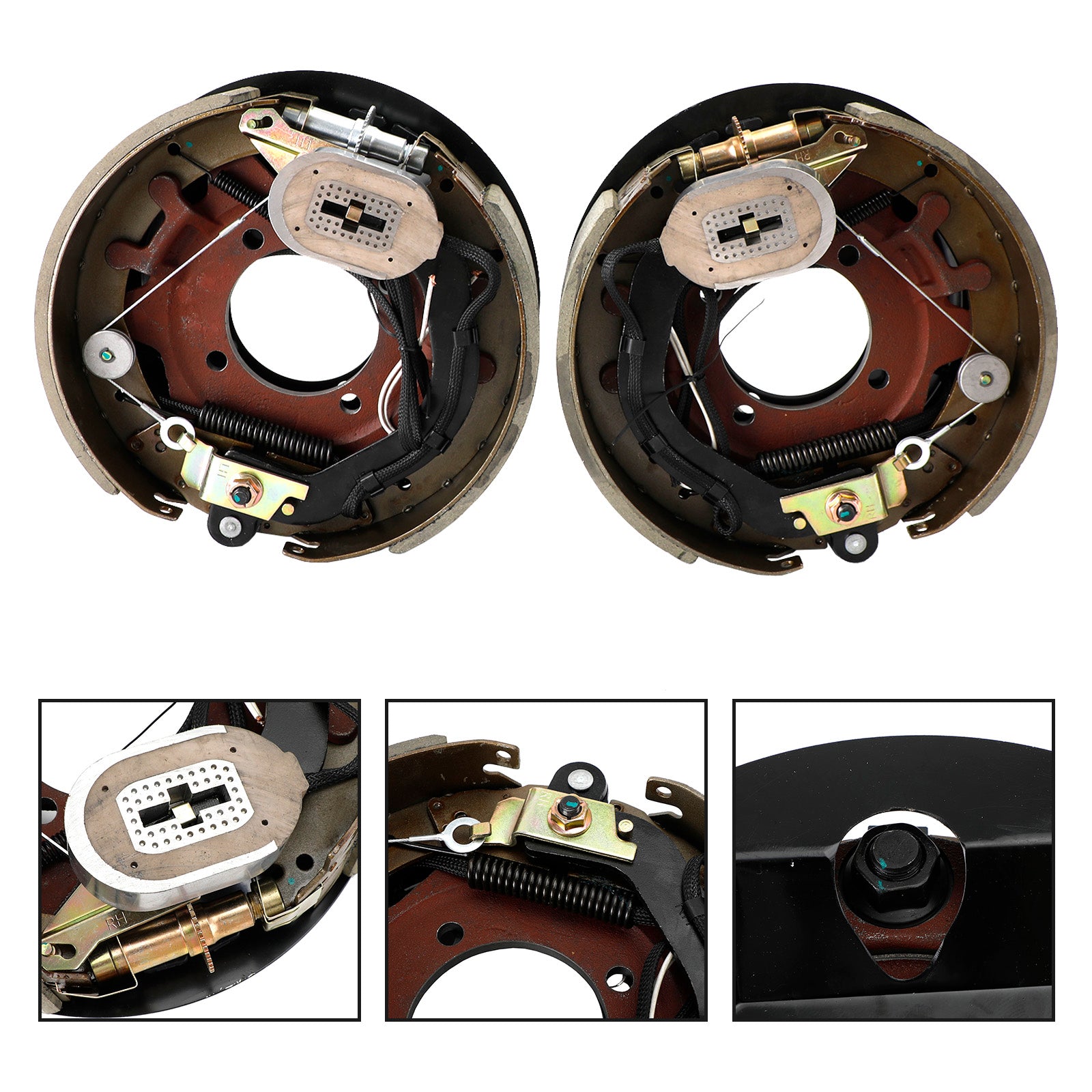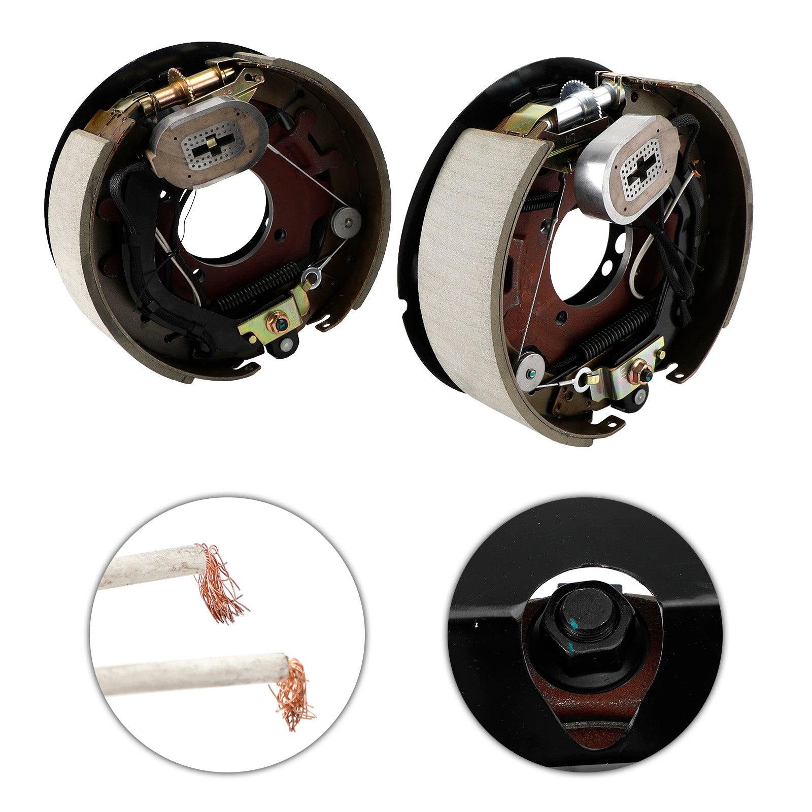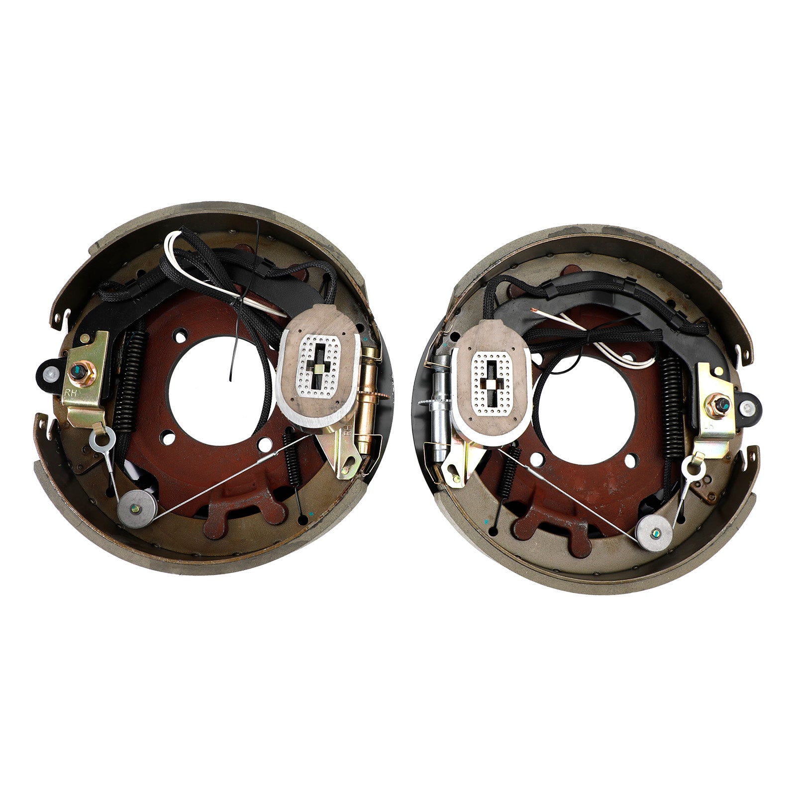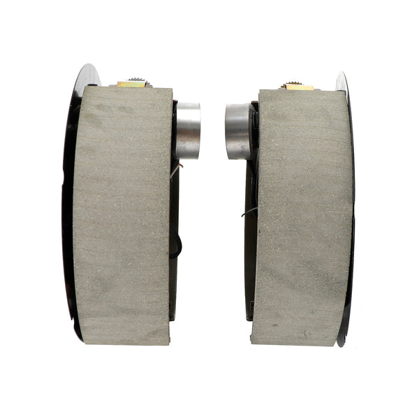 Self-adjusting electric brakes measure 12-1/4" x 3-3/8". Brake pads are made of durable friction material for improved braking. E-coated backing plates resist rust. Dust shields protect from debris. Fit 15" or larger wheels.